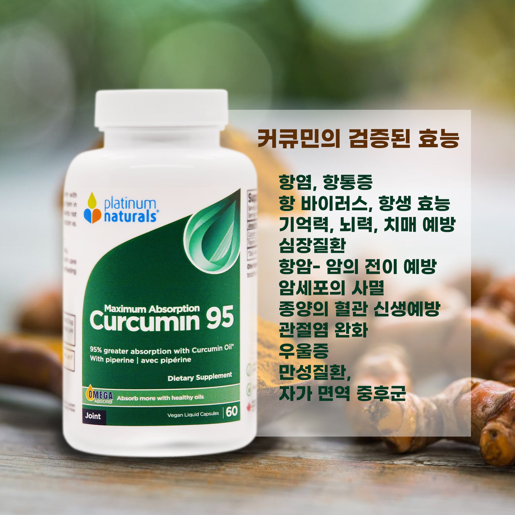 강황의 유익한 성능인 커큐민은 소화 흡수가 어려워 다양하고 좋은 효능을 충분히 받을수 없는 것이 단점이지만 플레티넘 내츄럴스사만의 유일한 방식으로 해결하여 가장 높은 흡수율(95%)로 최고의 효능을 받을수 있게 제조하였습니다.