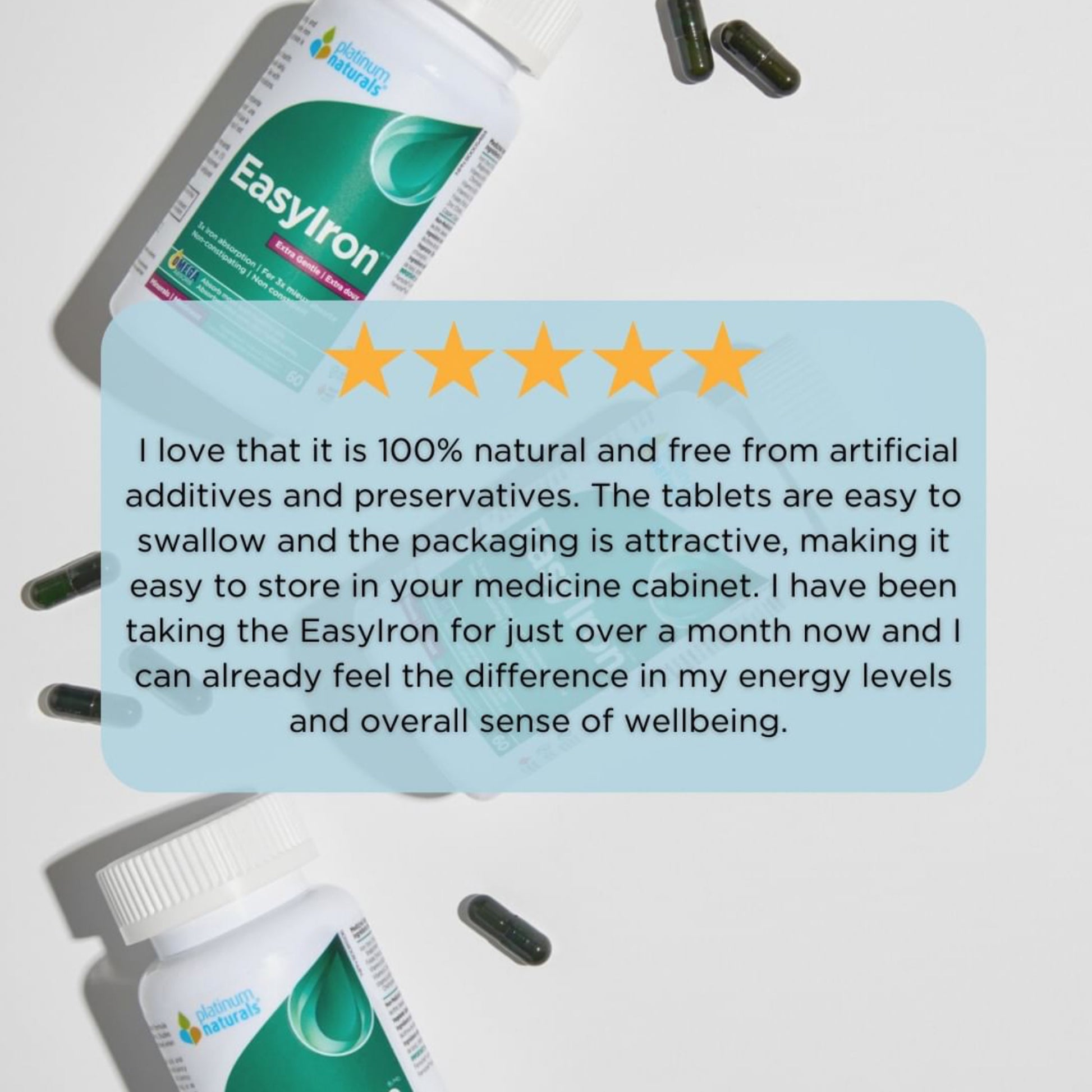 Many people suffer from constipation when they take Iron supplements because Iron that’s not absorbed remains in the colon. EasyIron is absorbed easily and therefore much less likely to cause constipation.