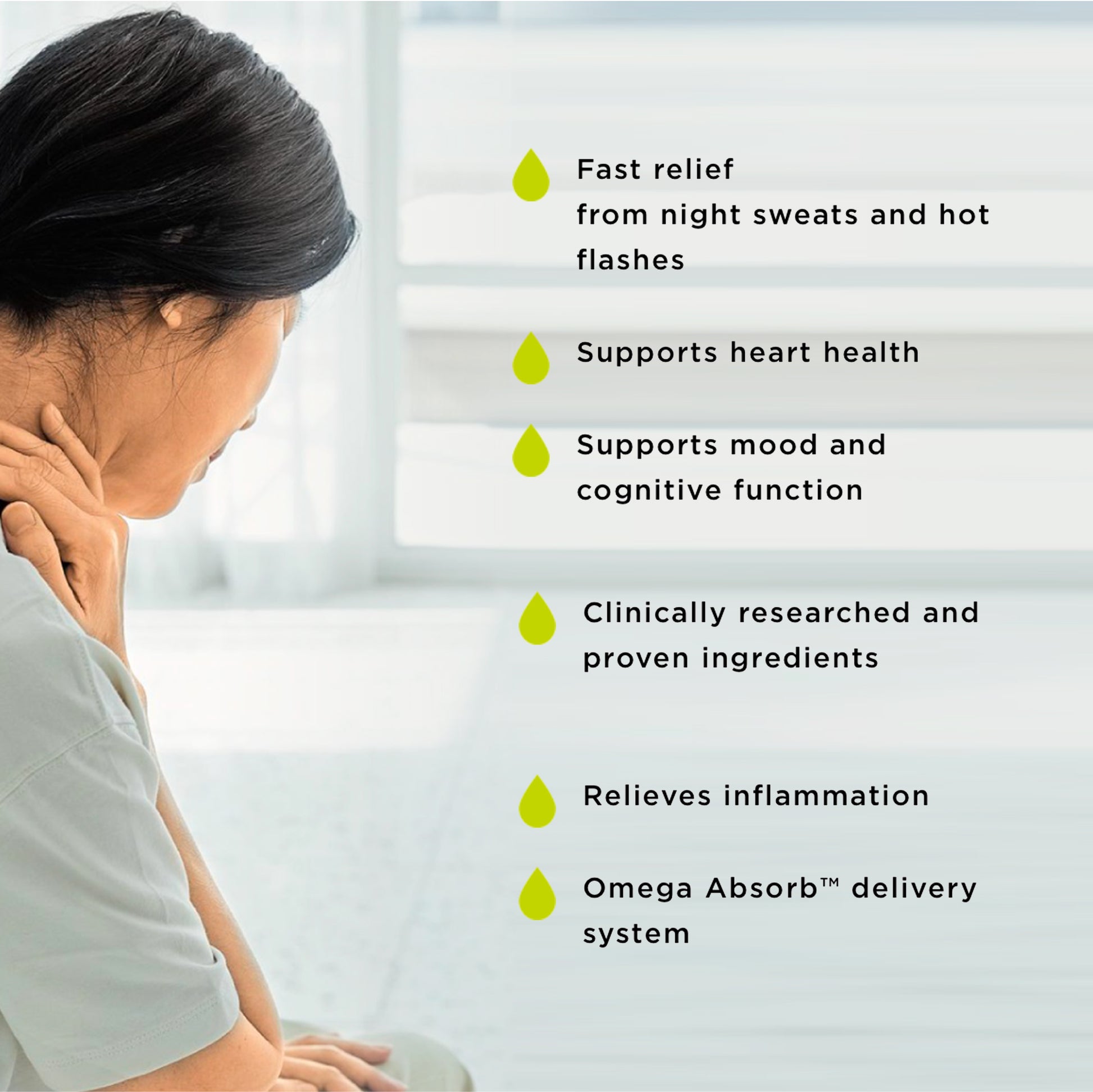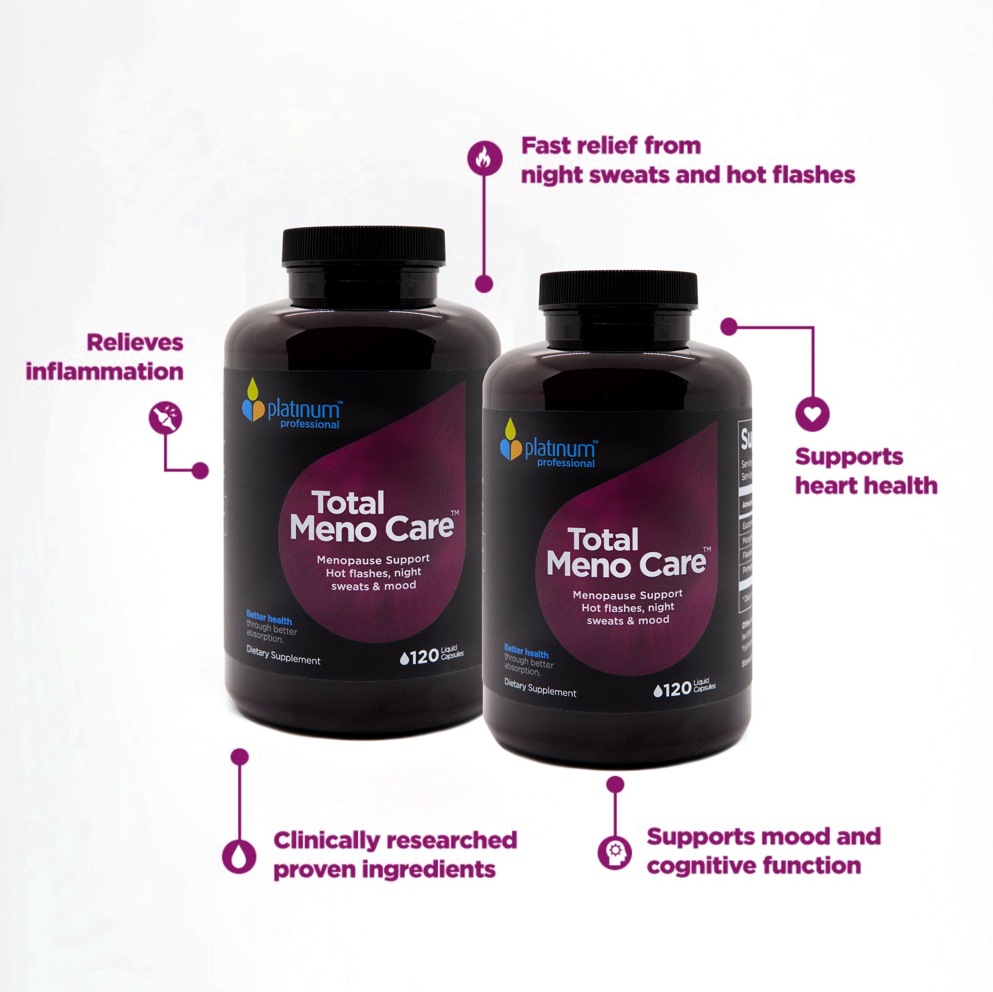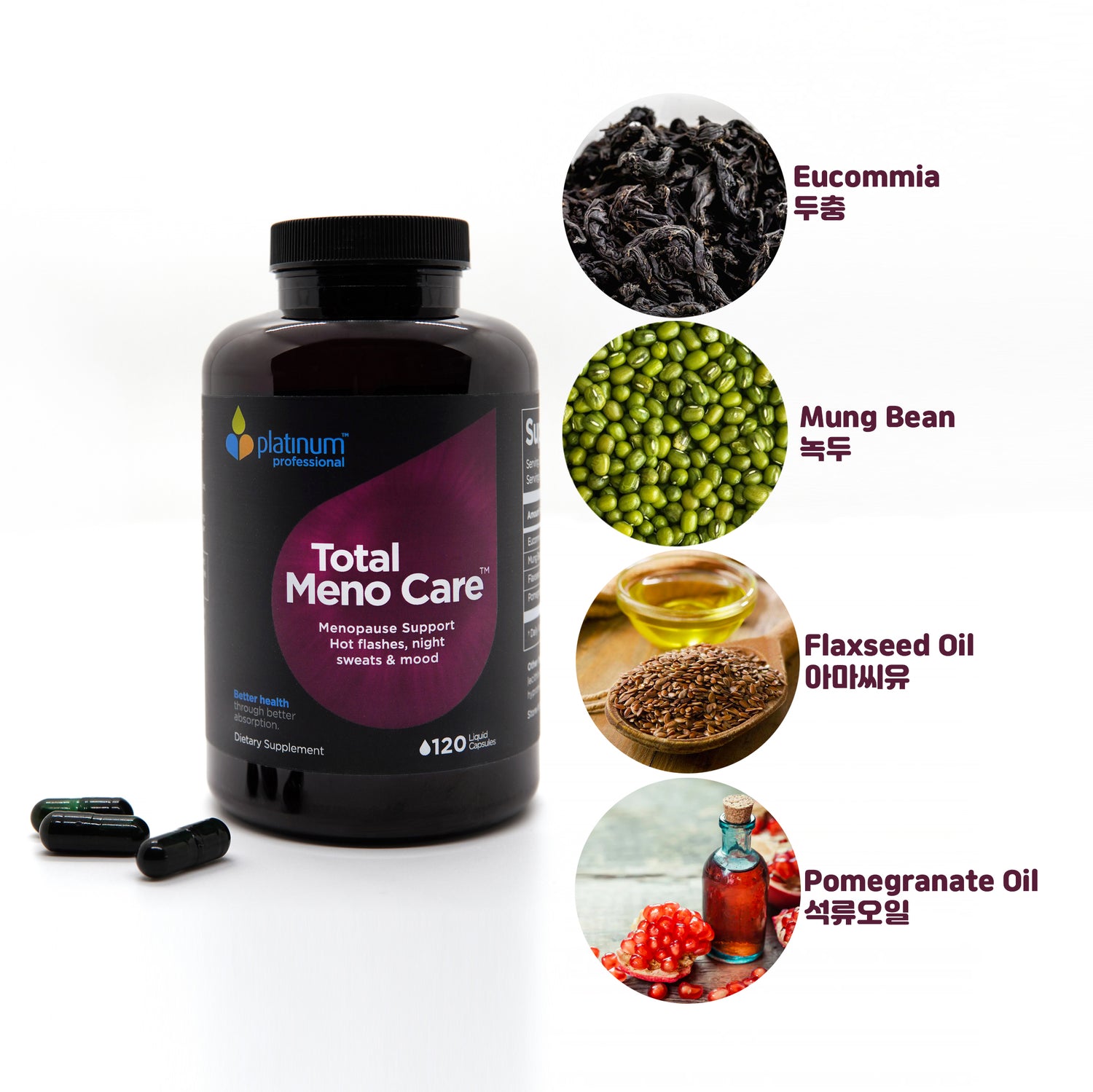 Total Meno Care combines clinically proven ingredients, Eucommia and Mung Bean, to help manage symptoms and discomfort associated with perimenopause and menopause including hot flashes and night sweats. It also includes pomegranate seed oil, a potent source of antioxidants proven to help reduce the number of hot flashes and reduce symptoms of vaginal dryness.