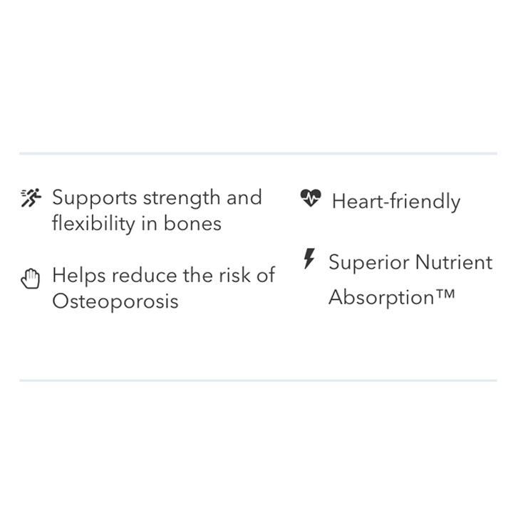 칼슘과 필수 영양소 인 마그네슘, 비타민 D 및 비타민 K2를 결합하여 최적의 뼈 건강을 유지합니다.