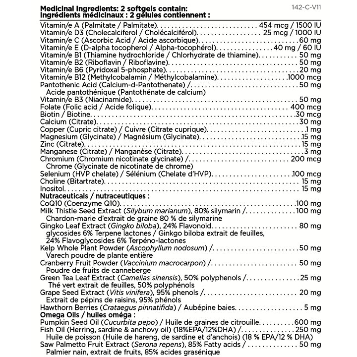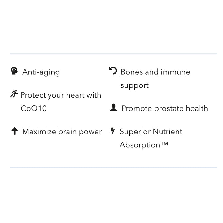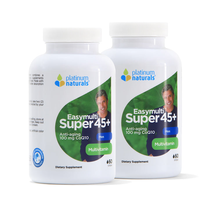 Coenzyme Q10 (CoQ10) is a potent antioxidant that is involved in energy production in the heart. It protects LDL cholesterol from oxidizing and helps lower blood pressure. By age 40, we may no longer produce enough CoQ10 to meet our daily needs. Super Easymulti 45+ for Men has 100mg of CoQ10, Omega-3 Fish Oils, and Hawthorn Berries plus a full complement of B vitamins for heart health.
